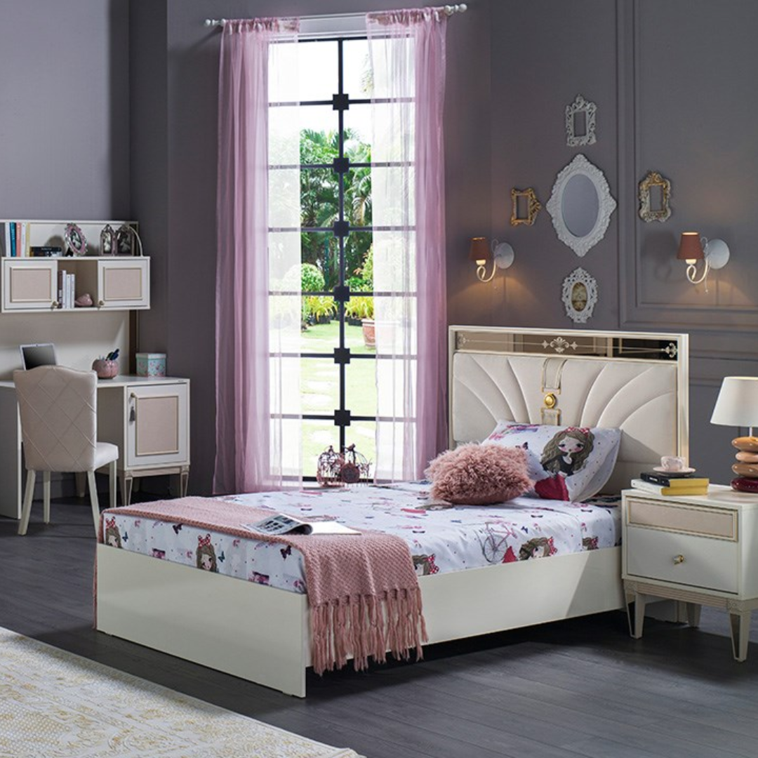 L’ensemble de chambre Rosalina Youth est conçu dans une couleur blanche opaque et est un produit visuellement élégant soutenu par des tons poudrés romantiques.